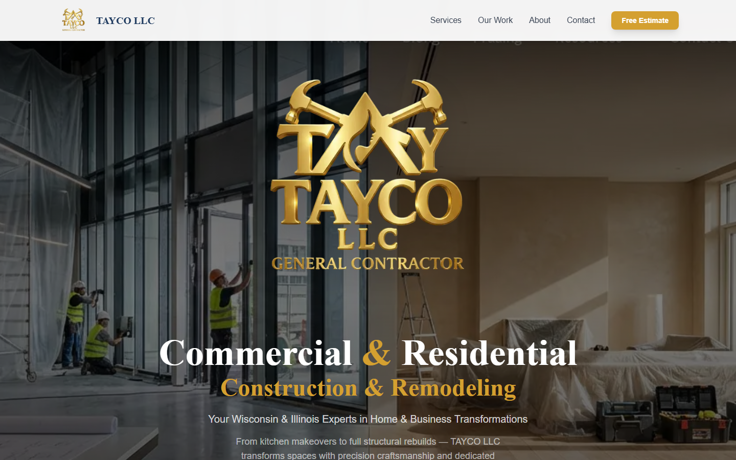 Corporate website for a licensed contractor operating in Wisconsin and Illinois. Full service catalog, project showcase, lead generation with WhatsApp integration, and mobile-first responsive design.